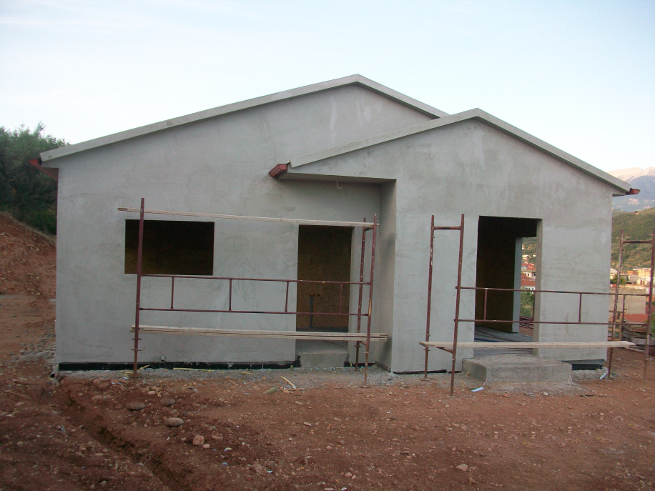 The "bricks" are assembled by following a steel beam railing on the floor and the entire wall is constructed without needing columns of reinforced concrete or steel beams (for low buildings), while the roof of synthetic material is pressed and fastened on the wall.